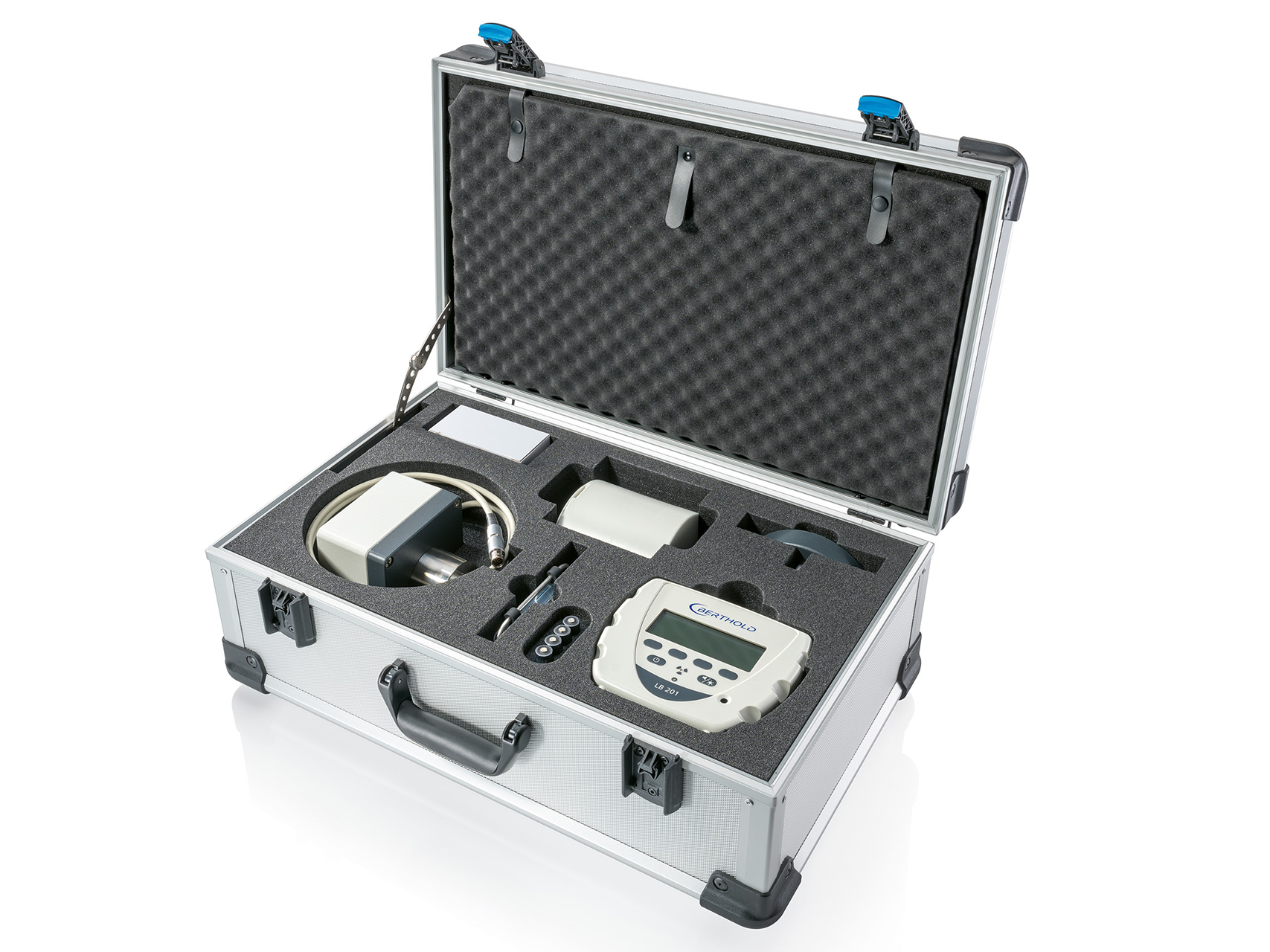 Auf Basis der Gerätegeometrie und der Einsatzanforderungen wurde ein stabiler Spezialkoffer mit individuell gefertigter Schaumeinlage entwickelt.